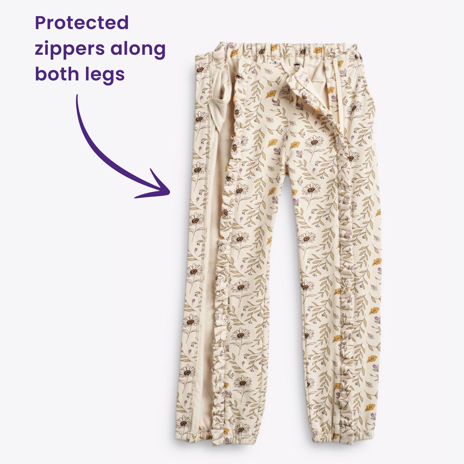 with zippers on both legs to facilitate the dressing process, baggy and loose fit on the back for accommodating diapers, raised waistline and no back seams for wheelchairs users, etc...