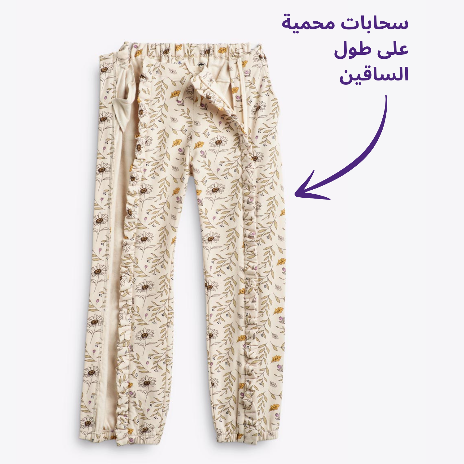 مع سحابات على كلا الساقين لتسهيل عملية ارتداء الملابس، وتصميم فضفاض على الظهر لاستيعاب الحفاضات، وخصر مرتفع وعدم وجود طبقات خلفية لمستخدمي الكراسي المتحركة، إلخ.