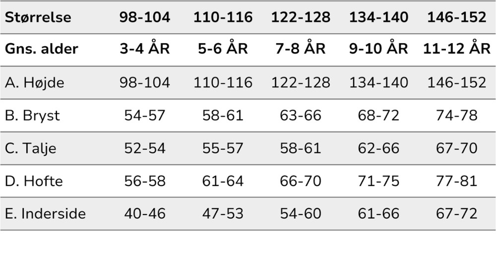 For eksempel: Hvis dit barn er 8 år og 133 cm høj, skal du vælge størrelse 134-140.