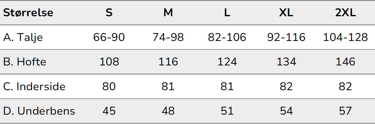 Hvis din person ligger mellem to størrelser, anbefaler vi, at du vælger den største størrelse.