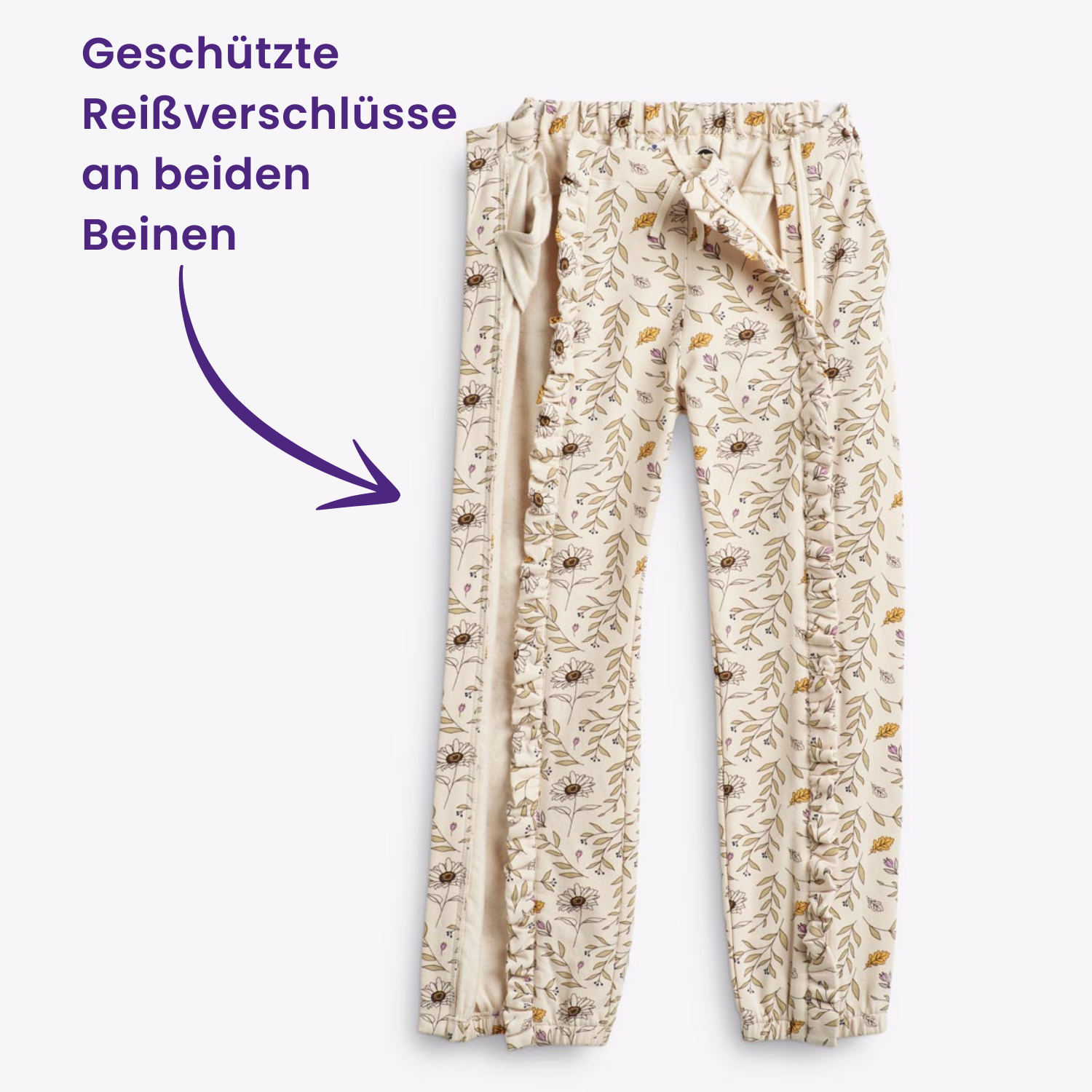 mit Reißverschlüssen an beiden Beinen zur Erleichterung des Anziehens, weite und lockere Passform am Rücken zur Aufnahme von Windeln, erhöhte Taille und keine Rückennähte für Rollstuhlfahrer, etc.
