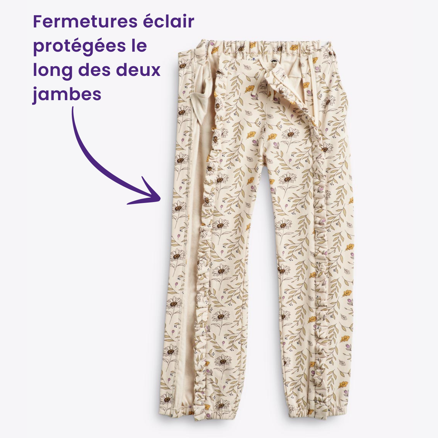 avec des fermetures éclair sur les deux jambes pour faciliter le processus d'habillage, une coupe ample et lâche dans le dos pour accueillir les couches, une taille rehaussée et l'absence de coutures dans le dos pour les utilisateurs de fauteuils roulants, etc...