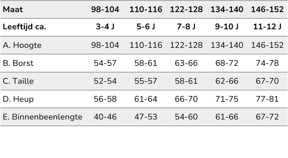 Bijvoorbeeld: als je kind 8 jaar oud is en 133 cm lang, moet je maat 134-140 kiezen.