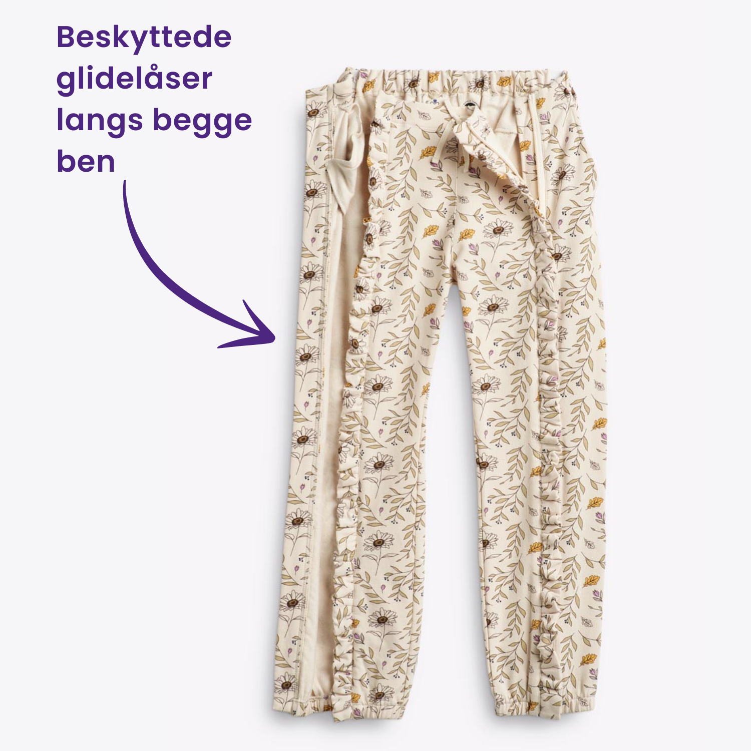 - Glidelåser på begge bena for enklere påkledning, beskyttet på innsiden